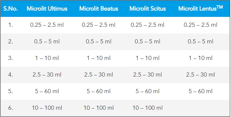 Microlit 瓶口分液器——Ultimus、Beatus、Scitus 和 Lentus™ ——也有不同容量可供選擇。